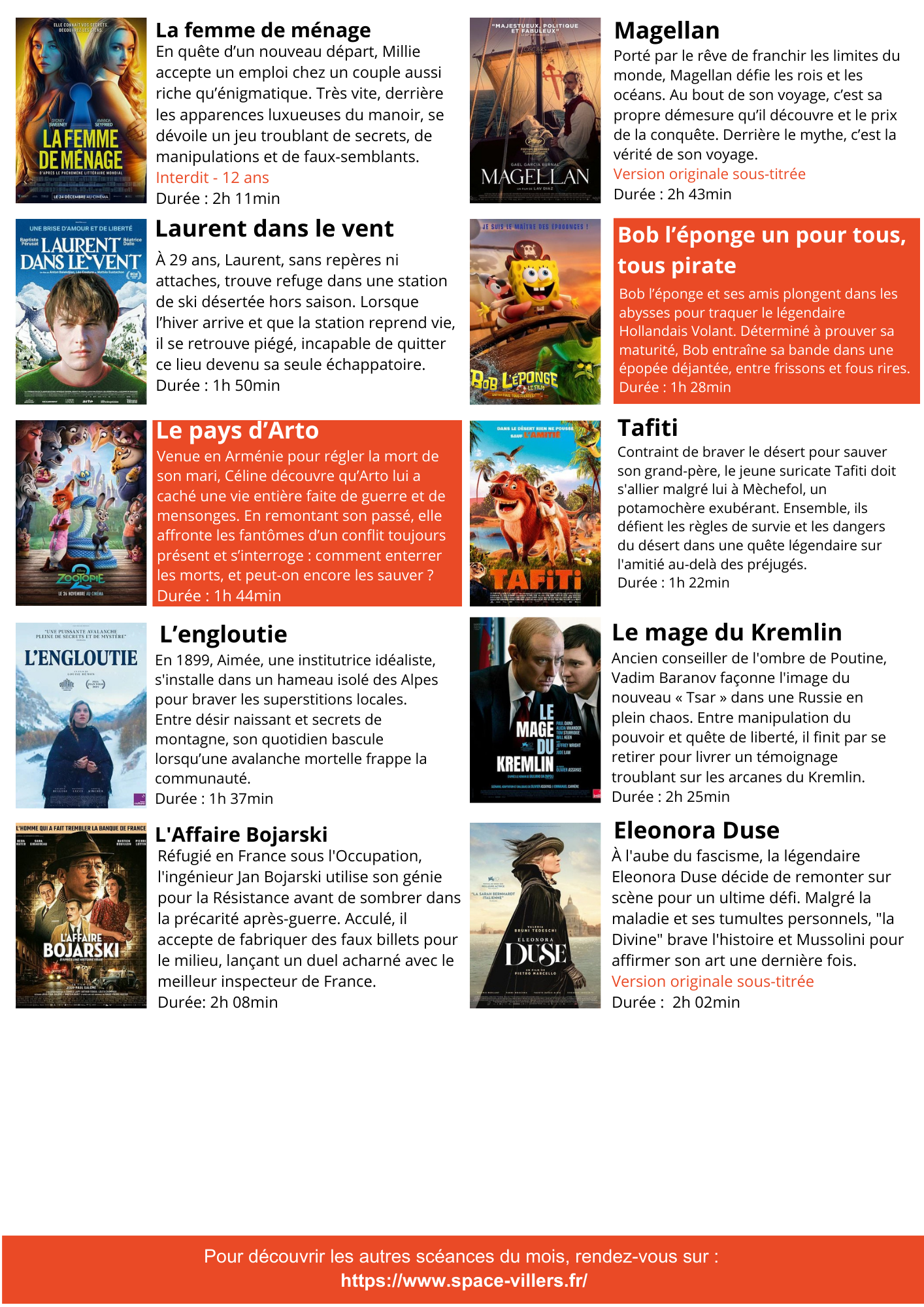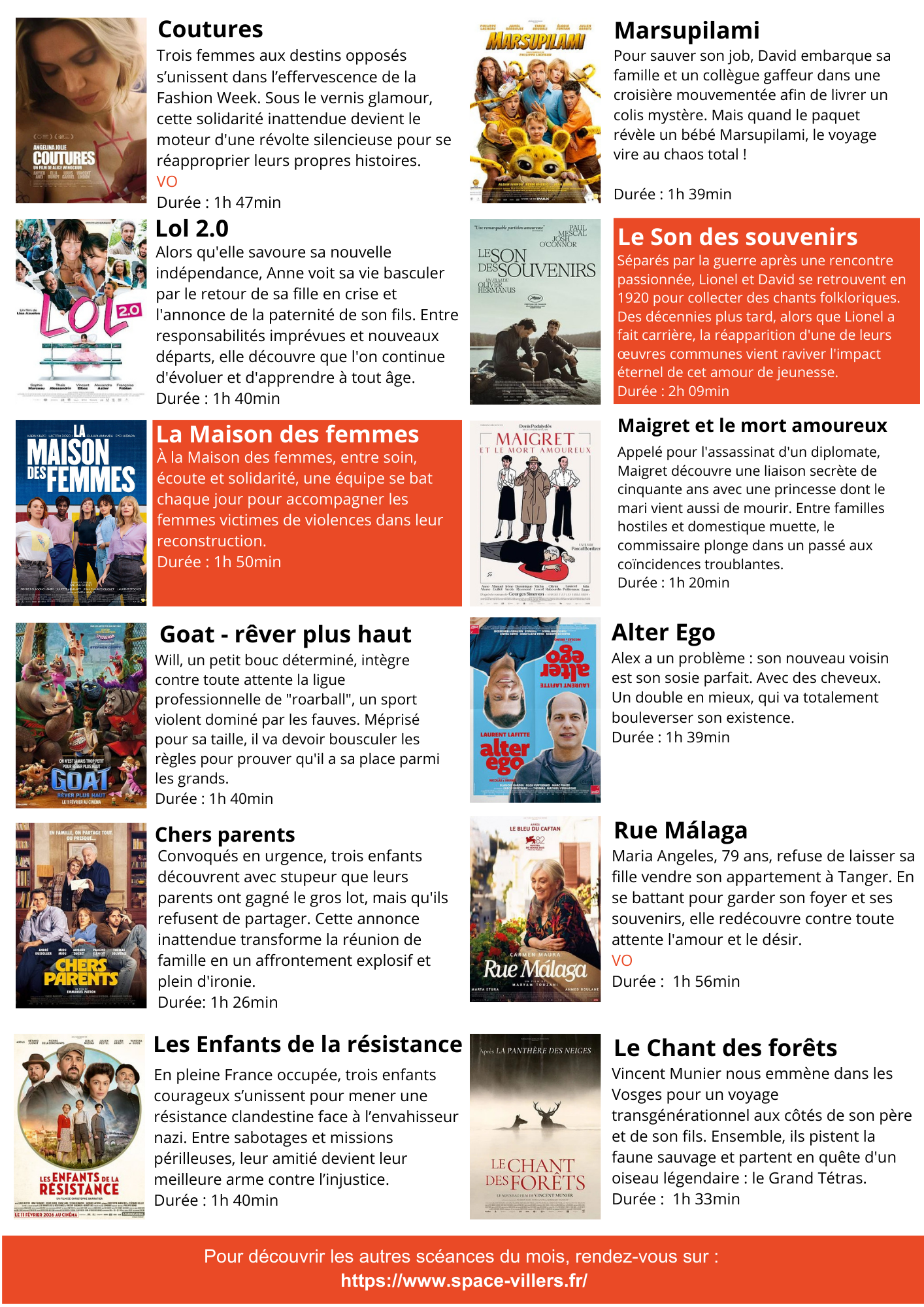 *Tarif réduit : Collégiens, lycéens, étudiants, + de 60 ans, associations Villersoises, demandeurs d’emplois, handicapés