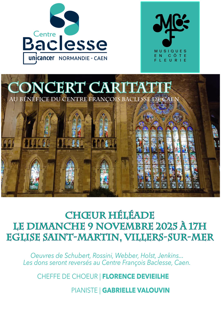 L’ensemble Héléade de Musiques en Côte Fleurie donnera un concert caritatif au bénéfice du Centre François Baclesse de Caen, le dimanche 9 novembre en l’église Saint-Martin de Villers-sur-Mer à 17h.